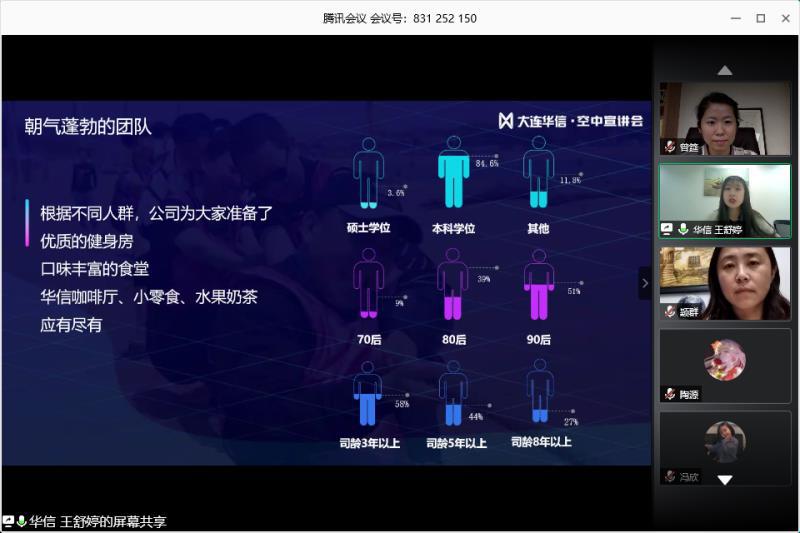 2020年6月11日晚19:30,由于疫情影响,Beat365中文官方网站特邀请大连华信计算机技术股份有限公司,在腾讯会议平台,为我院日语专业大三的学生召开了“大连华信实习线上宣讲会”。本次宣讲会由大连华信人力资源负责人白璐主持,王舒婷为主讲人,Beat365中文官方网站副书记王颖群、日语系主任曾妍及全体2017级日语专业学生参加了本次会议。