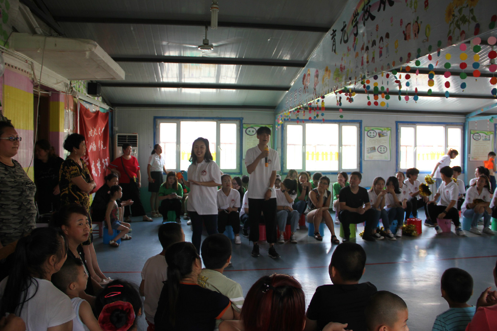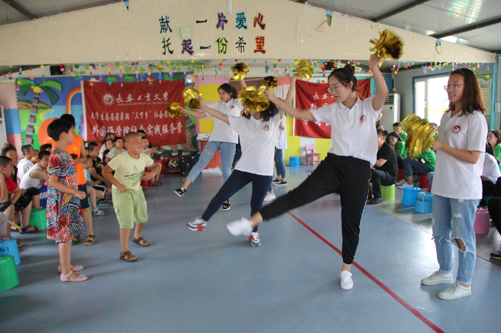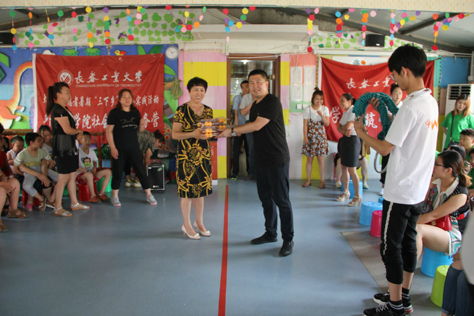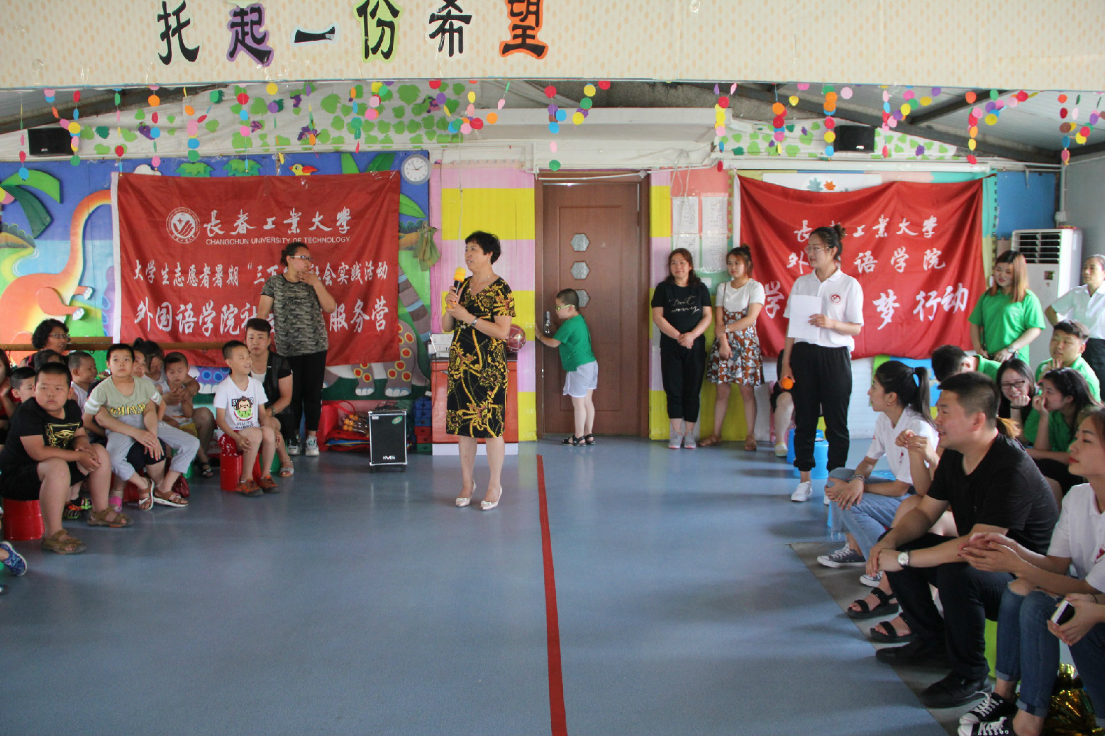 首先育龙特殊儿童康复学校校长向小朋友和家长们介绍了本次社会实践活动的基本情况,并代表学校对志愿者们的到来表达了热烈的欢迎和感谢,随后学校的小朋友们表演了歌舞《最美的光》和《宝贝宝贝》正式拉开了此次活动的帷幕,我院志愿者同学们现场表演了歌曲《Decision》、《小酒窝》以及欢快的啦啦操舞蹈,现场小朋友和同学们一起开心的互动起来,全场掌声不断,现场气氛热烈而欢快,节目表演后,进行了爱心捐赠活动,赵海涛老师代表学院捐赠给孩子们一些体育用品,希望他们能健康快乐地成长;最后,赵海涛老师发表讲话,对育龙学校为同学们提供这次宝贵的社会实践机会表达了衷心的感谢,并希望以此次活动为契机加深两校合作,建立长期的支援服务关系,并向孩子们表达了衷心的祝愿。