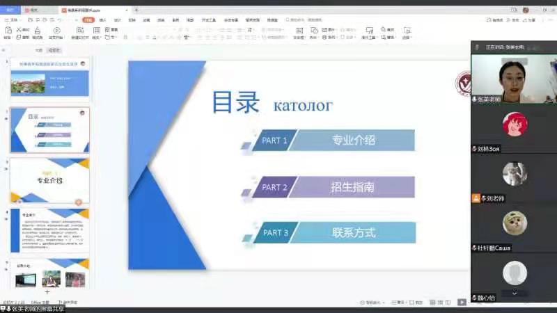 在俄语专业组,张美从专业简介、研究方向、开设课程、出国留学、毕业生就业等方面详细介绍了俄语语言文学方向的情况,并对2022年的招生计划、考试科目、网上报名流程等进行了说明。最后,刘继彬老师对张美主任的细致讲解表示衷心的感谢。