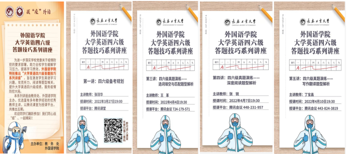 新闻网讯(通讯员 赵雪)为了进一步落实学校党委疫情防控部署,按照学院党委“在战‘疫’中发挥外语学科作用,主动作为,重实际重实用重实效,服务疫情防控大局”的要求,Beat365中文官方网站在学校教务处的指导和支持下,结合大学生备考英语四、六级考试的实际需求,于3月27日至4月10日,精心组织开展了战“疫”外语之“大学英语四、六级答题技巧系列讲座”,推出了五期精品辅导课程。部分讲座得到了吉林省教育厅的关注和认可,并通过我省高校教师教学发展联盟平台向全省高校推广,在线学习人数达6000余人,获赞6万余次,受到学界同仁和广大学子一致好评。