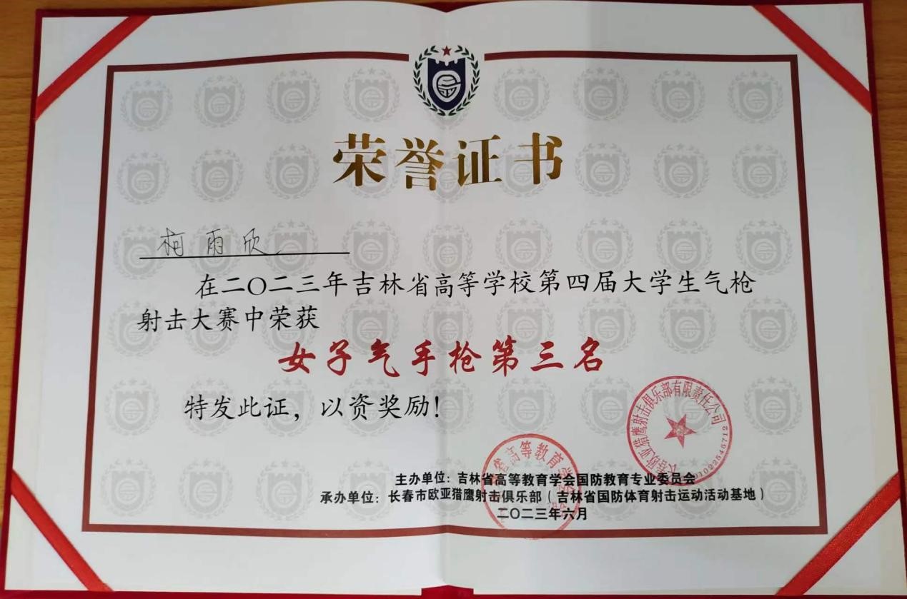 (通讯员 张晓君 柯雨欣 魏瑶)为进一步落实立德树人根本任务,增强学生国家安全意识,培养学生国防素质观念。吉林省高等教育学会国防教育专业委员会于6月10日主办吉林省高等学校第四届大学生气枪射击大赛。我院柯雨欣同学参加本次比赛并取得女子气步枪第一名和女子气手枪第三名的好成绩。