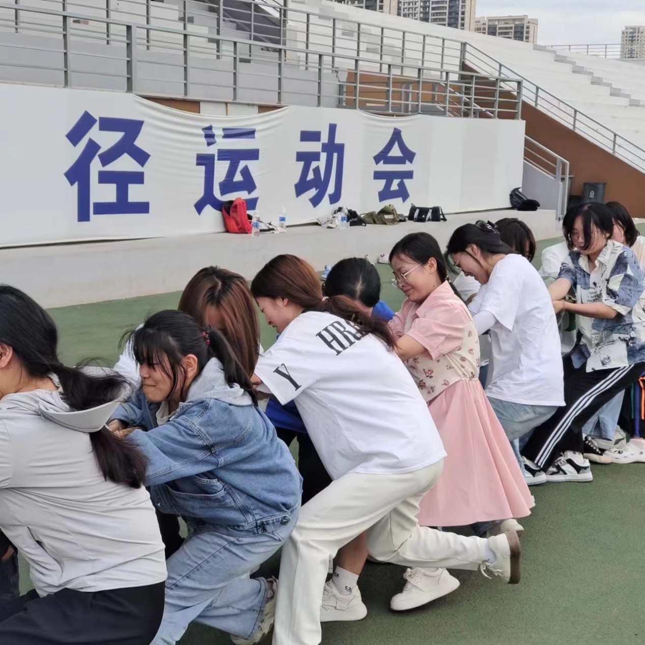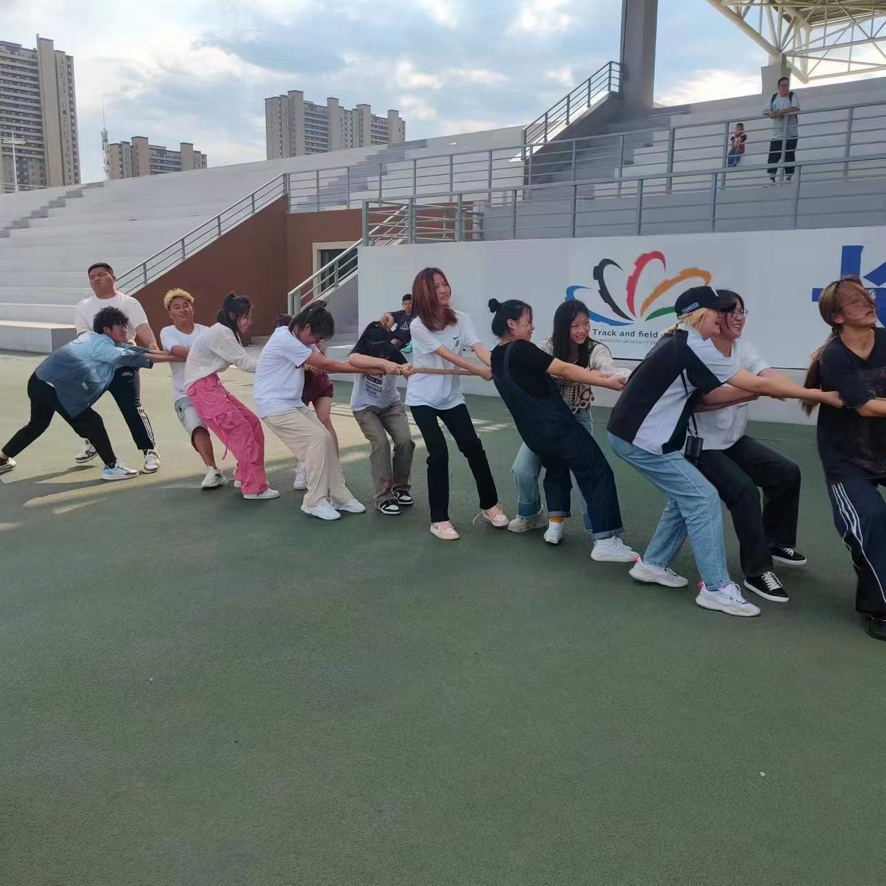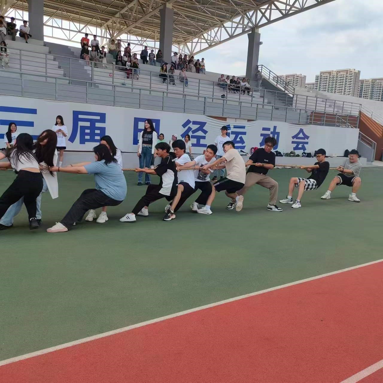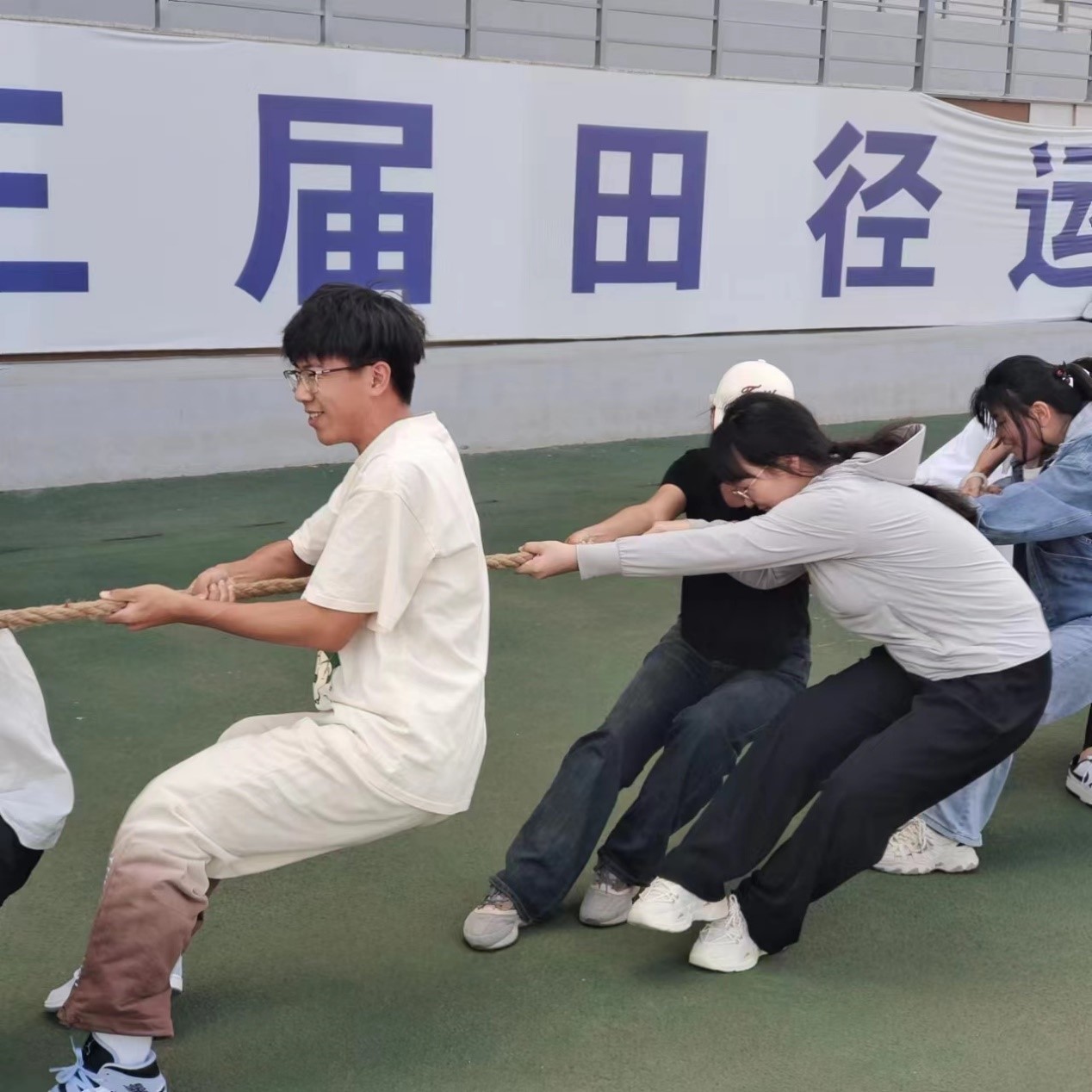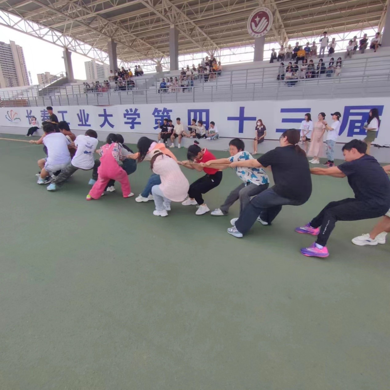 随着裁判员一声哨响,双方同学们扎稳马步,重心后压,紧握长绳,力量拉满。节奏、步伐、发力协调配合,同学们为了集体荣誉拼尽全力,在来回拉锯战中,挑战着体能的极限,彰显着团队凝聚力。赛场气氛热烈活跃,拉拉队员们的呐喊助威声响彻全场。