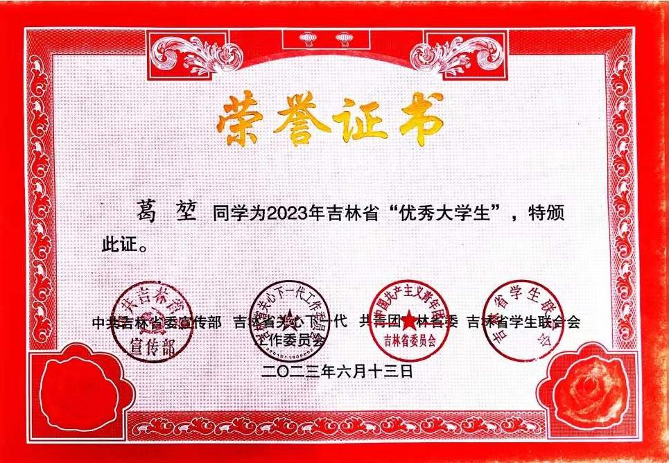 (通讯员 张晓君)近日,由中共吉林省委宣传部、共青团吉林省委员会、吉林省关心下一代工作委员会、吉林省学生联合会共同开展的2023年吉林省“优秀大学生”寻访活动结果揭晓。我院葛堃同学在2023年吉林省“优秀大学生”寻访活动中获得“优秀大学生”荣誉称号。