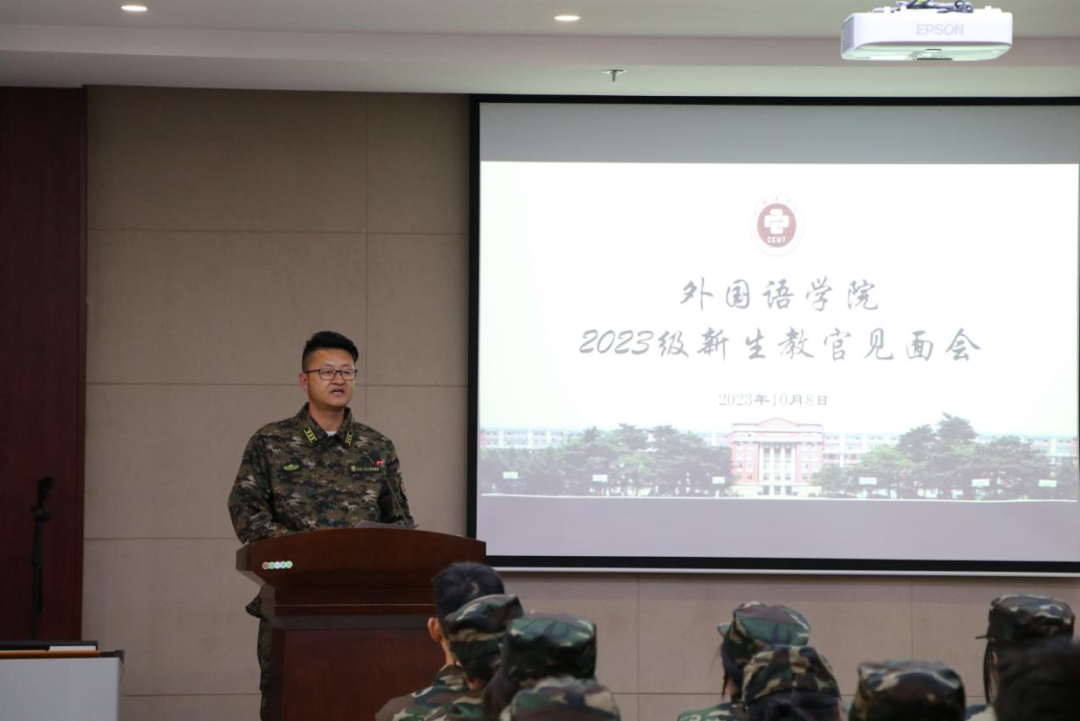 本网讯(通讯员 张晓君 张子涵)为了更好地开展2023级新生军训活动,让同学们提前感受军训氛围,激发同学们昂扬的斗志,2023年10月8日,Beat365中文官方网站在主楼435举行2023级新生军训教官见面会。会议由Beat365中文官方网站新生辅导员刘明慧主持,党委副书记于伟、军训带队教官以及全体2023级新生参加此次见面会。