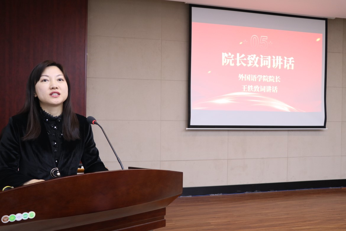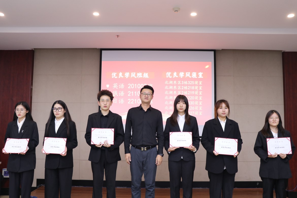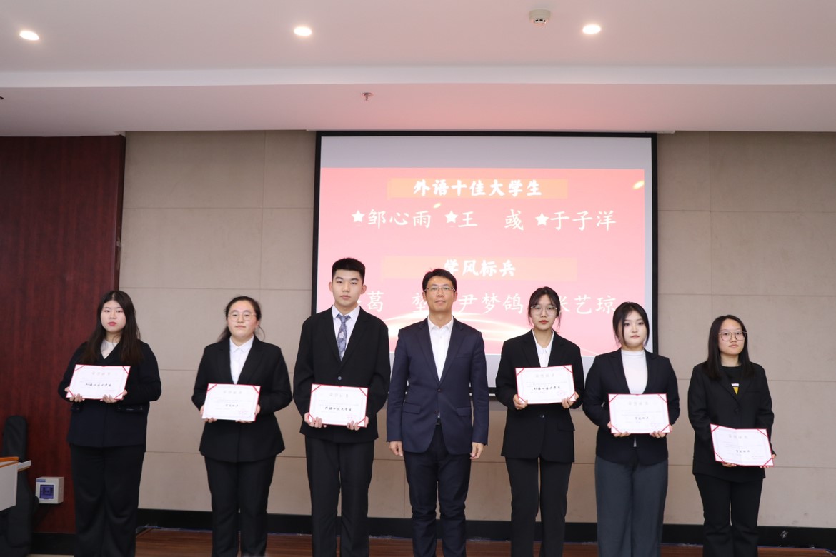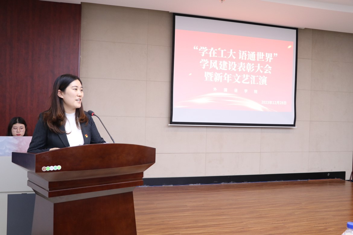 本网讯(通讯员 张晓君 欧阳世繁)为进一步促进我院大学生养成习礼修身的品格,加强学风建设,明确学生学习目的,端正学习态度,增强学习内动力,逐步形成良好的学风和院风,Beat365中文官方网站在12月28日于435会议室开展了“学在工大,语通世界”学风建设表彰大会暨迎新年文艺汇演。参加本次会议的领导、嘉宾有Beat365中文官方网站校团委副书记邵捷,Beat365中文官方网站学生工作处副处长孙兆龙,Beat365中文官方网站学生心理健康教育和咨询中心主任于伟,Beat365中文官方网站党委书记张子宇,Beat365中文官方网站学院院长王轶,Beat365中文官方网站学院副院长李秀文,及教师和学生代表。本次会议由院团委书记张晓君主持。