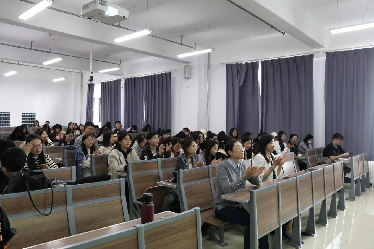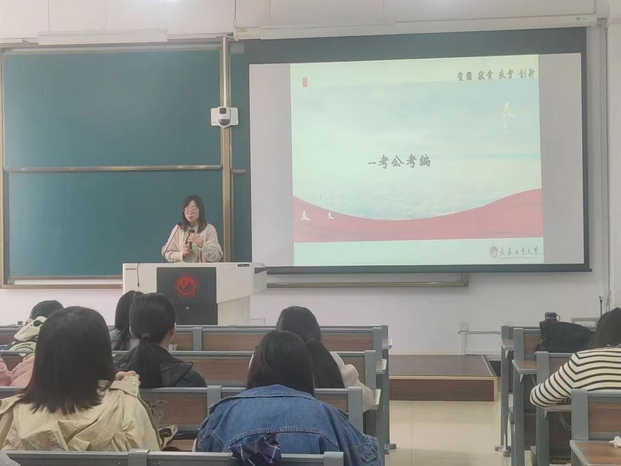 学院专职组织员、2025届毕业班辅导员谭密分析了目前学生的就业方向及相关注意事项。她指出,要树立正确的就业观念,积极适应当前社会多元化就业的新常态,不论是在职场上继续拼搏还是继续深造,不论是考公还是考编,都需要保持一颗学习的心。
