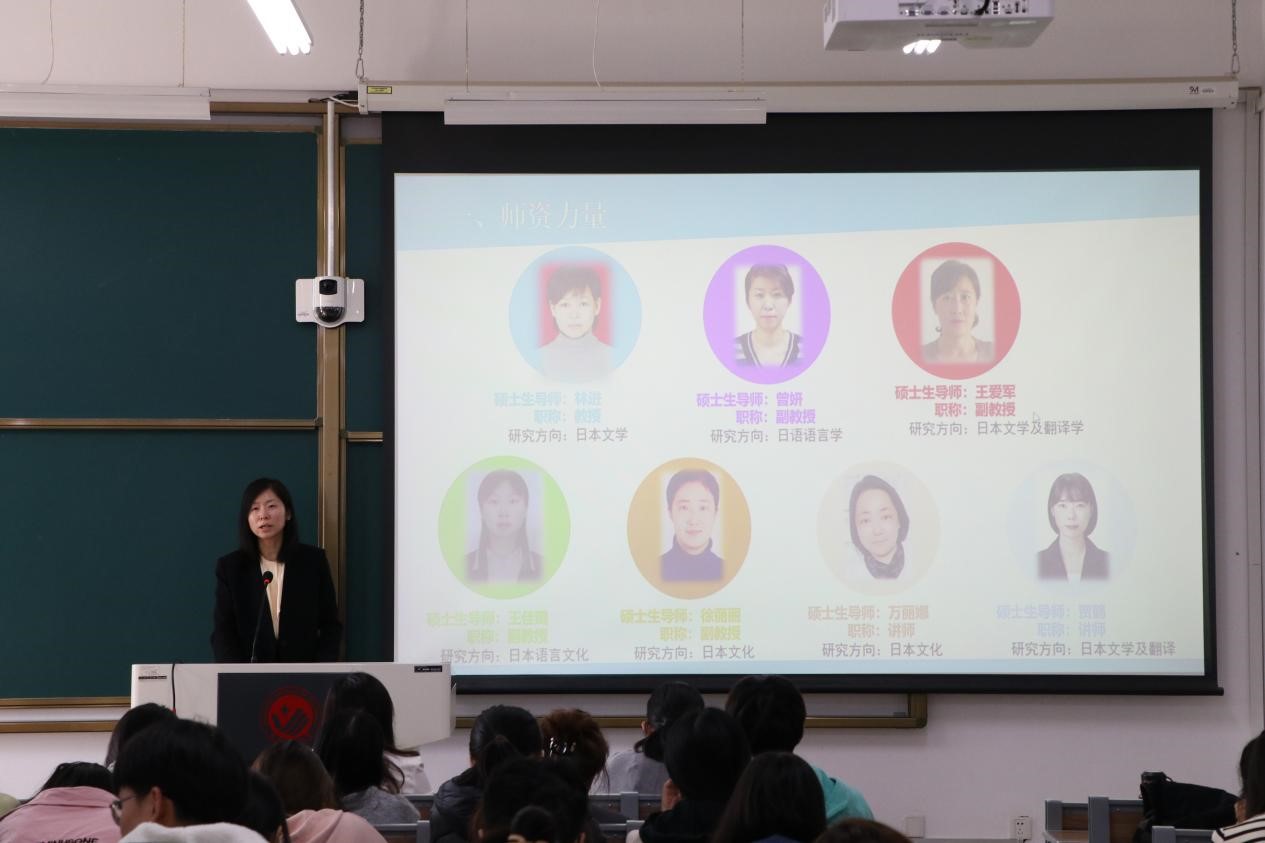 副院长曾妍对日语语言文学专业的师资队伍、研究方向、专业优势、学生就业、考研注意事项等问题进行了细致的说明。通过讲述我院往届毕业生的实际考研案例,鼓励同学们进行科学的自我评估,明确自己的目标方向,选择适合的院校和考研方案,坚持目标,勇于挑战,为考研做好充分的准备。