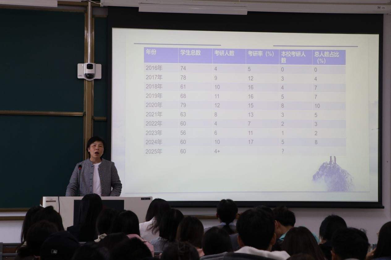 最后,院长王轶进行总结发言。她指出,学院高度重视毕业生的考研及就业工作,重点给同学们分析了专硕与学硕的区别、一志愿考生与调剂考生的不同以及明年考研形势的变化,鼓励同学们积极应对未来的机遇与挑战。她进一步强调,考研是对一个人在学术和人生方面的提升机会,应该努力把握;就业不仅是学生个人的责任,更是其事业发展的关键环节,应该努力学习科学文化知识,树立正确的人生观、价值观以及积极的就业观。明确人生目标并为之奋斗,要敢于面对人生的挑战。