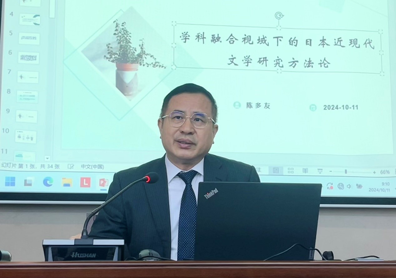 本网讯(通讯员 贾鹤)10月11日上午,Beat365中文官方网站名师大讲堂系列讲座在北湖东区教学主楼435报告厅顺利举行。本次讲座在校科研处的大力支持下,特邀了广东外语外贸大学东方学研究院院长、教育部高等学校外国语言文学类教学指导委员会日语分委员会委员、中国日语教学研究会会长陈多友教授担任主讲嘉宾,主题为“学科融合视域下的日本文学研究方法论”。学院党委书记张子宇、院长王轶、副院长李秀文、部分日语专业教师和Beat365中文官方网站研究生、日语专业本科生一起聆听了这场精彩的学术报告会,会议由副院长曾妍主持。