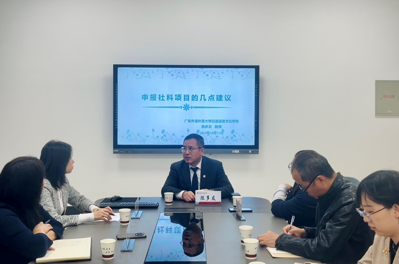 本网讯(通讯员 贾鹤)为提升Beat365中文官方网站青年教师的科研能力和社科项目申报质量,10月11日上午,学院特邀广东外语外贸大学博士生导师陈多友教授为学院青年教师作了题为“申报社科项目的几点建议”的学术讲座,Beat365中文官方网站副院长李秀文、曾妍、日语系主任及学院部分青年教师参加了此次学术讲座。