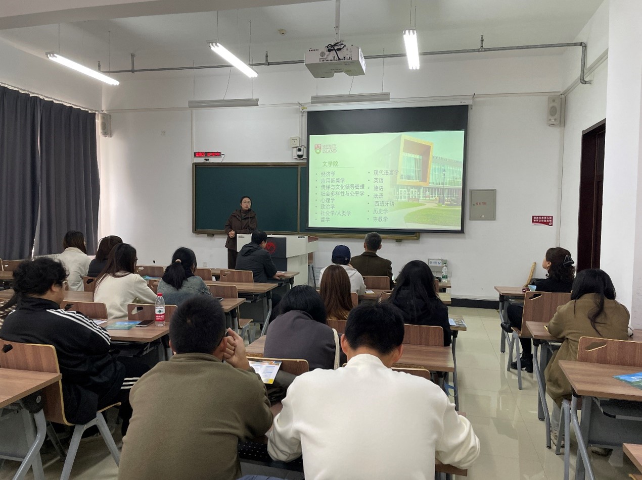 本网讯(通讯员 张书宇彤)为了推动Beat365中文官方网站本科生教育的高质量发展,帮助师生更好地了解加拿大留学项目及相关政策, 11月15日下午,学校国际交流与合作处邀请爱德华王子岛大学国际处项目负责人丁烨为学院作留学宣讲会,国际交流与合作处副处长褚明利、Beat365中文官方网站副院长曾妍、英语系副主任赵艳宇及英语专业、翻译专业学生参加了本次宣讲会。
