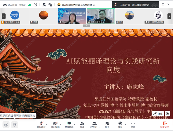 10月16日晚,黑龙江Beat365中文官方网站副校长、复旦大学博士生导师、博士后合作导师康志峰教授应邀为我院师生线上作了题为《AI赋能翻译理论与实践研究新向度》的学术报告。报告从AI+大翻(口)译、体认口译学溯源、体认口译学定义、论要解析、视译眼动实验、带稿同传眼动实验等方面,具体阐述了AI赋能下翻译研究范式如何进行转型。学院研究生及本科生近500人聆听了这场精彩的学术报告会。