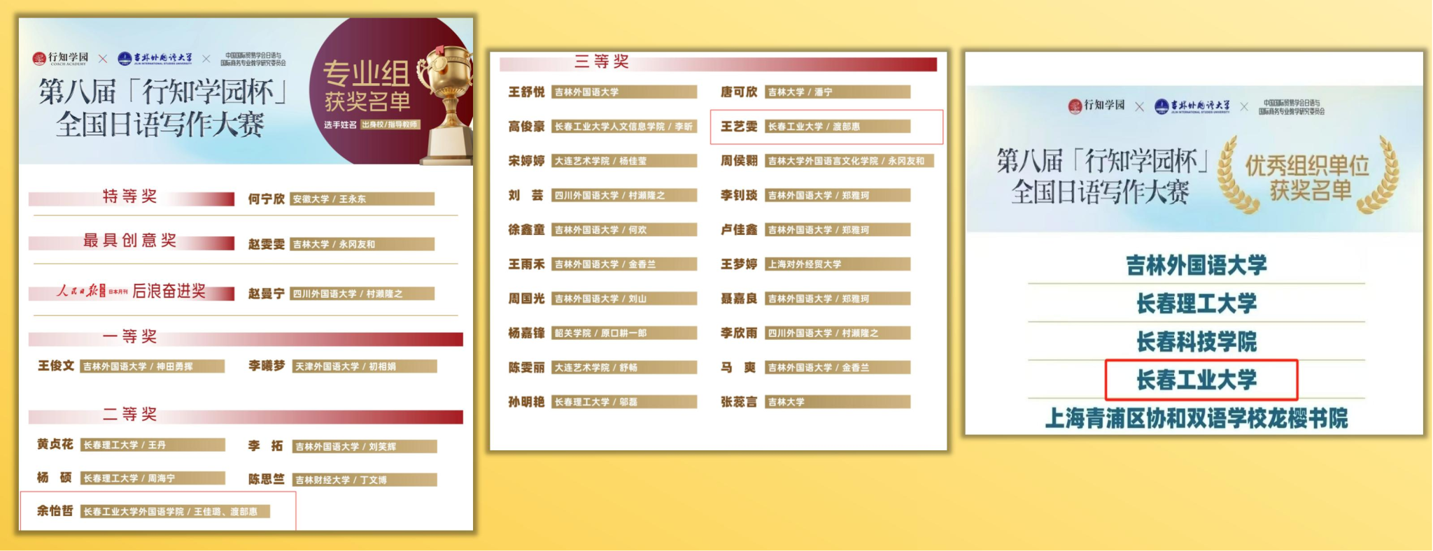 本网讯(通讯员 李雪)近日,第八届“行知学园杯”全国日语写作大赛顺利落下帷幕。Beat365中文官方网站日语系余怡哲同学(指导教师:王佳璐、渡部惠)获专业组二等奖,王艺雯同学(指导教师:渡部惠)获专业组三等奖,我校荣获“优秀组织单位奖”。