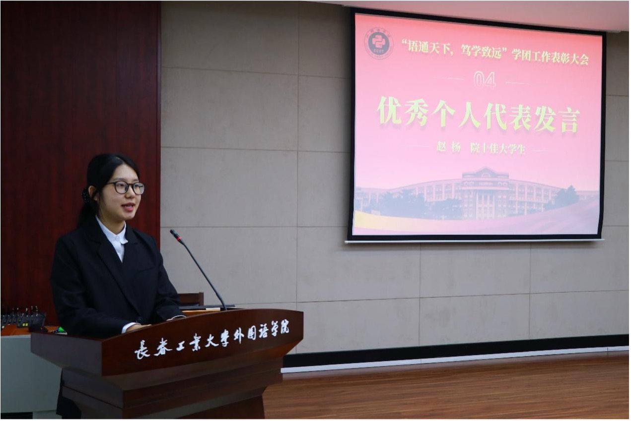 学院“十佳大学生”赵杨同学作为受表彰优秀个人代表,结合自身求学经历,分享了在学院三年的成长蜕变之路:在老师们的悉心指导与热忱帮助下,她于学业钻研中精进专业本领、锤炼语言能力,在日常实践里涵养品德修为、砥砺优良品格,以奋斗之姿逐梦前行,用青春热血奔赴成长。
