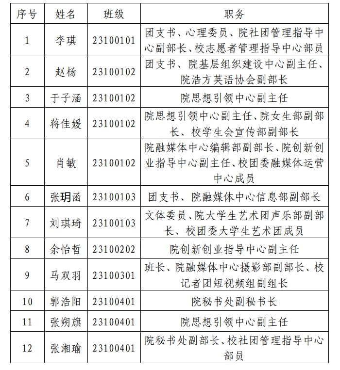 为了认真贯彻党的发展党员工作方针,充分发扬民主,增强发展党员工作的透明度,把好发展党员质量关,确保新党员质量,经学院党委研究,现将已列入2025年度发展计划,且通过党支部民主测评的发展对象在全院范围内公示。公示时间为5个工作日(2025年9月3日至2025年9月9日)。在公示期内,党内外群众如对发展对象有意见,请以真实单位、姓名,用书面、电话等形式如实反映情况。群众反映的问题受到法律保护,我们将严格保密。