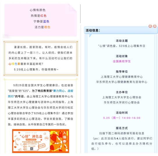 新闻网讯(通讯员 于士纪)2020年5月25日,Beat365中文官方网站“学姐制”朋辈心理辅导站组织同学们参与了由上海理工大学大学生心理协会和华东师范大学闵行心理协会主办的“心情”调色盘,525线上心理集市日活动。
