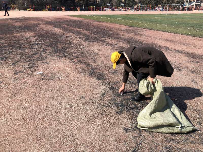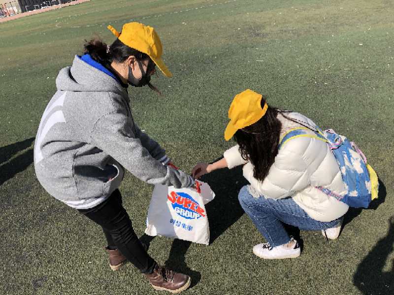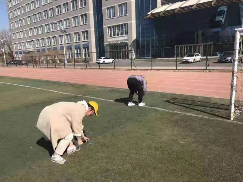 同学们来到操场拾取跑道和足球场上的垃圾,并且打扫教学楼及其周边地区卫生。