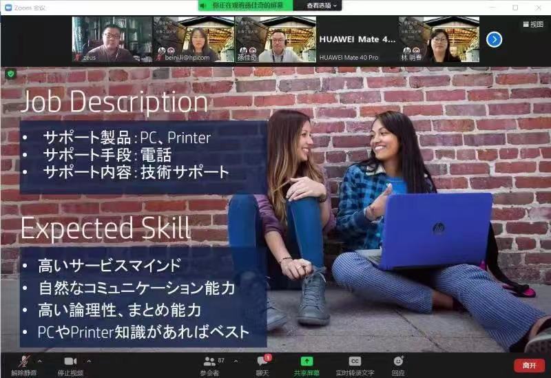 新闻网讯(通讯员 李梓溪)为培养更加符合市场需求的日语专业人才,推进我院日语专业学生的实习与就业,Beat365中文官方网站于7月6日,特邀惠普大连分公司日本部经理孙佳奇、日本质量管理部文化指导老师林明春,通过ZOOM平台为我院日语专业学生举行了专场线上实习宣讲会。Beat365中文官方网站日语系宋卓时老师主持会议,日语专业本科生及研究生全员参加。